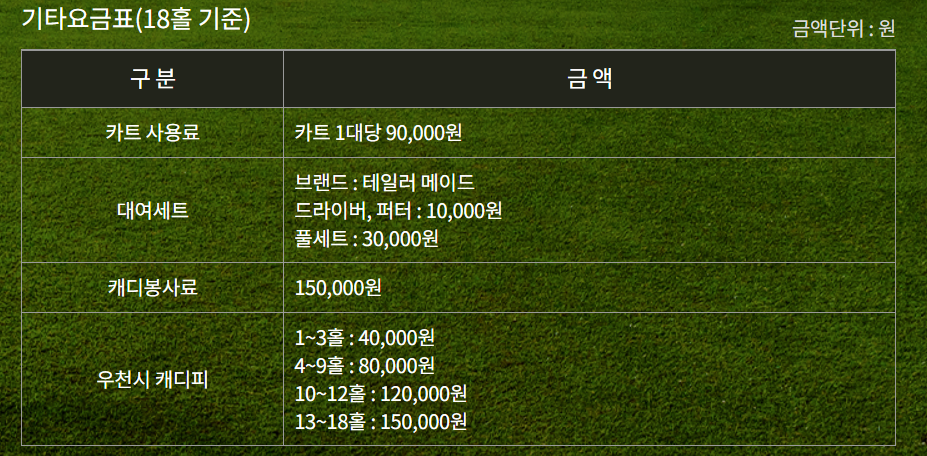 저는 토요일 주말 라운딩이라 총 25만2천원에 캐디비 4만원을 지불했는데요. 다른 골프장이 그렇듯 남여주GC도 기간마다 다르긴 해서 24년 12월 가격을 안내드립니다. 홈페이지 공식 가격은 아래와 같습니다.