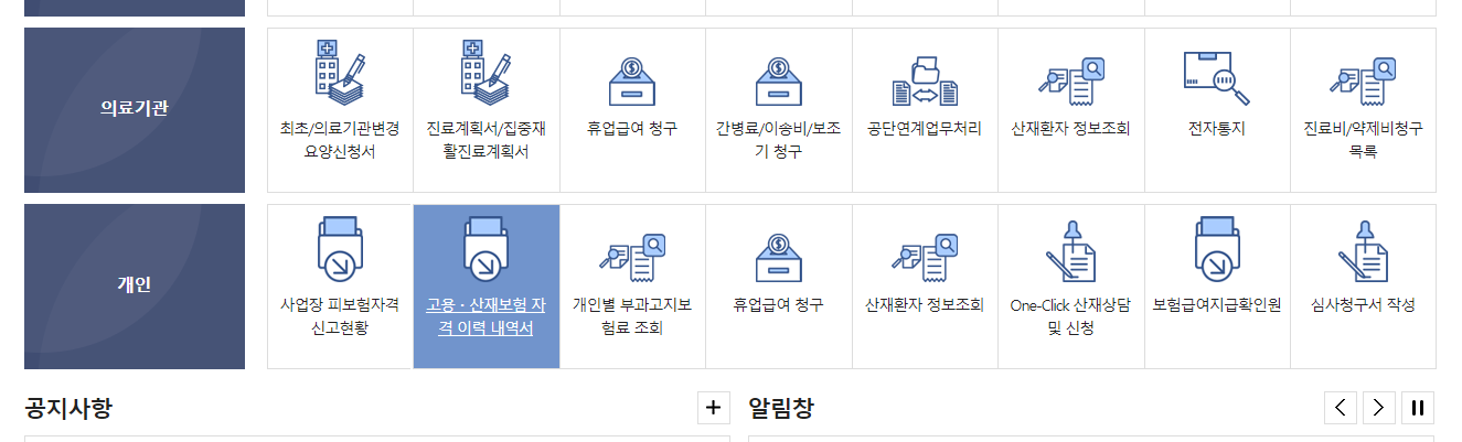 메뉴 > 고용, 산재보험 자격 이력 내역서