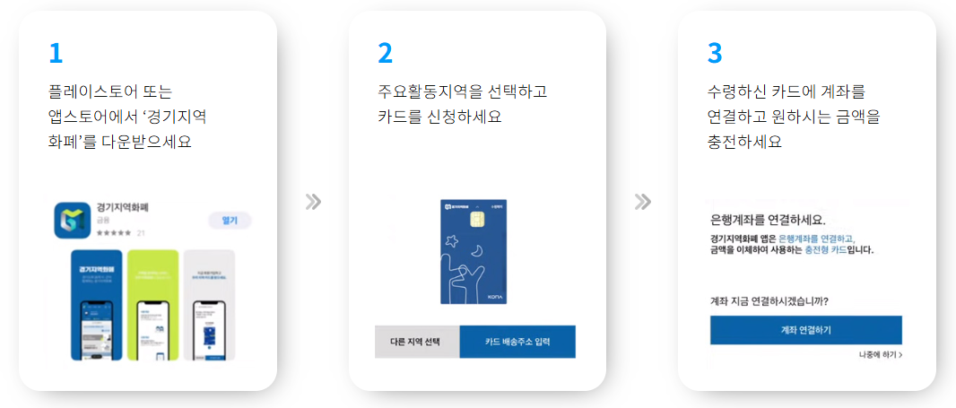 만약 경기지역화폐가 없으신 분들은 아래에서 경기지역화폐를 신청하셔서 발급받으시길 바랍니다.