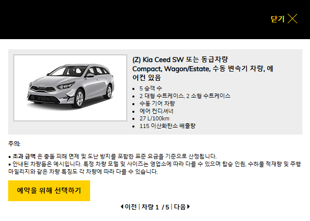 저희가 빌렸던 차는 기아 씨드라는 차량입니다. 소형 SUV로 5인승의 차량인데 2박 3일 렌트비용은 골드멤버쉽 적용해서 완전 면책, 카시트 포함해서 약 50만원이었습니다. 4인 가족이 타기 적당한 가격이었고, 차량 상태도 깨끗해서 만족스러웠습니다.