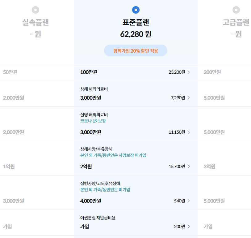 위의 화면처럼 직관적으로 보험료 조회가 가능해서 어렵지 않게 보험료를 계산할 수 있었어요. 특히 4인 이상인 저희 가족의 경우 함께 가입시 20%할인이 되기 때문에 한 달의 여행임에도 불구하고 6만원대의 저렴한 보험료가 책정되더라고요!