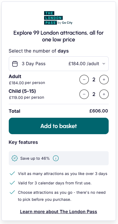 런던 패스 공식 홈페이지에서 안내되는 가격은 아래와 같습니다. 참고로 저희는 가족여행이라 4인 가족을 기준으로 검색했어요^^