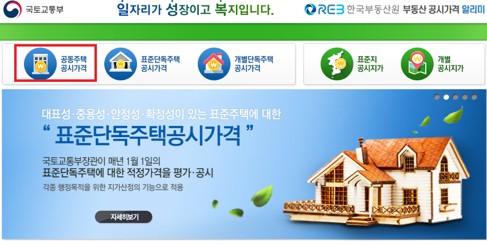 부동산 공시 가격을 확인하는 방법은 아래 국토교통부 홈페이지에서 진행하실 수 있습니다. 캡쳐된 화면을 보시며 따라해보시기 바랍니다.