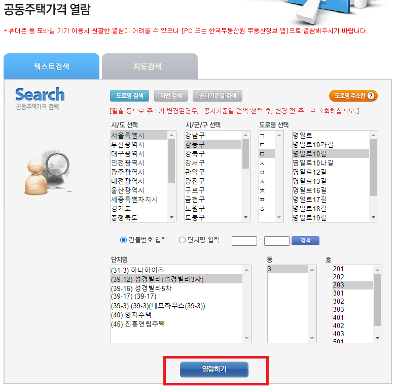3. 열람하기 버튼을 클릭하여 공시가격을 열람합니다.