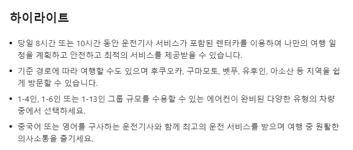 후쿠오카에는 차량투어 상품이 많은데요. 8시간에서 10시간 만 하루의 일정을 운전기사 포함해서 12인승 승합차로 다닐 수 있기도 하고, 가격적으로도 메리트가 있어서 추천해드려요..