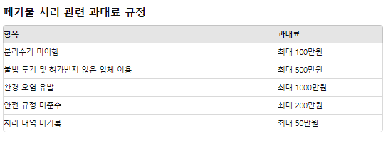 폐기물 처리 시 법적 규제를 준수하지 않으면 과태료가 부과될 수 있습니다. 다음은 주요 항목과 과태료 금액입니다.