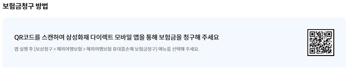 삼성화재 여행자보험 휴대폰 파손 보상 청구는 아래 QR코드를 통해 간편하게 보상 청구를 할 수 있습니다.