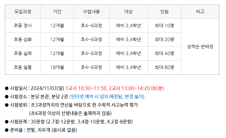시험범위가 초3까지의 연산 과정이고, 4학년 이상의 선행내용은 출제하지 않는다고 하니 기초가 튼튼하게 잡혀있는 친구들, 사고력 문제나 심화 문제를 평소에 풀어둔 친구들은 어느정도 준비가 되어있을 것 같습니다.