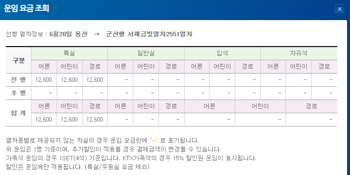 서해금빛열차의 예약 가격은 일반 객실과 온돌칸에 따라 다르게 책정됩니다. 아래는 서울 용산 출발 기준으로 노선이 짧아질 수록 가격이 저렴합니다.