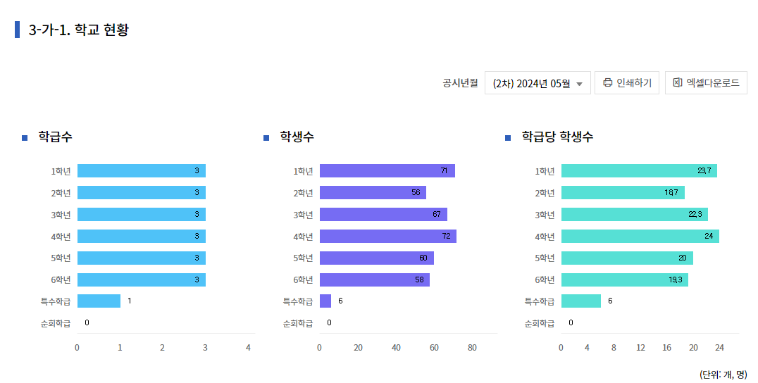 학년이 높아질 수록 학급당 학생 비율이 낮아지는 것을 볼 수 있는데요. 대부분의 수지 지역이 그렇듯 고학년이 되면 상급