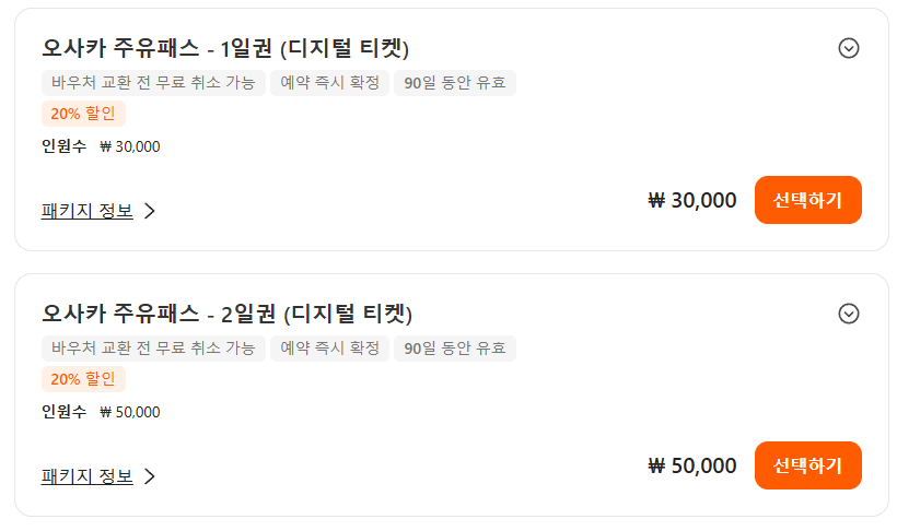 오사카 주유패스는 1일권의 경우 30,000원, 2일권은 50,000원으로 저렴한 가격입니다. 공식 홈페이지에서는 3,300엔 정도 하는데 오늘자 환율로 비교해보았을때 카드 수수료나 환율 수수료를 계산하니 클룩이 가장 저렴한 것 같더라고요.
