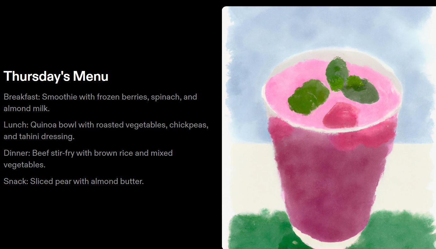 - 저녁 : 구운 연어와 퀴노아, 찐 브로컬리