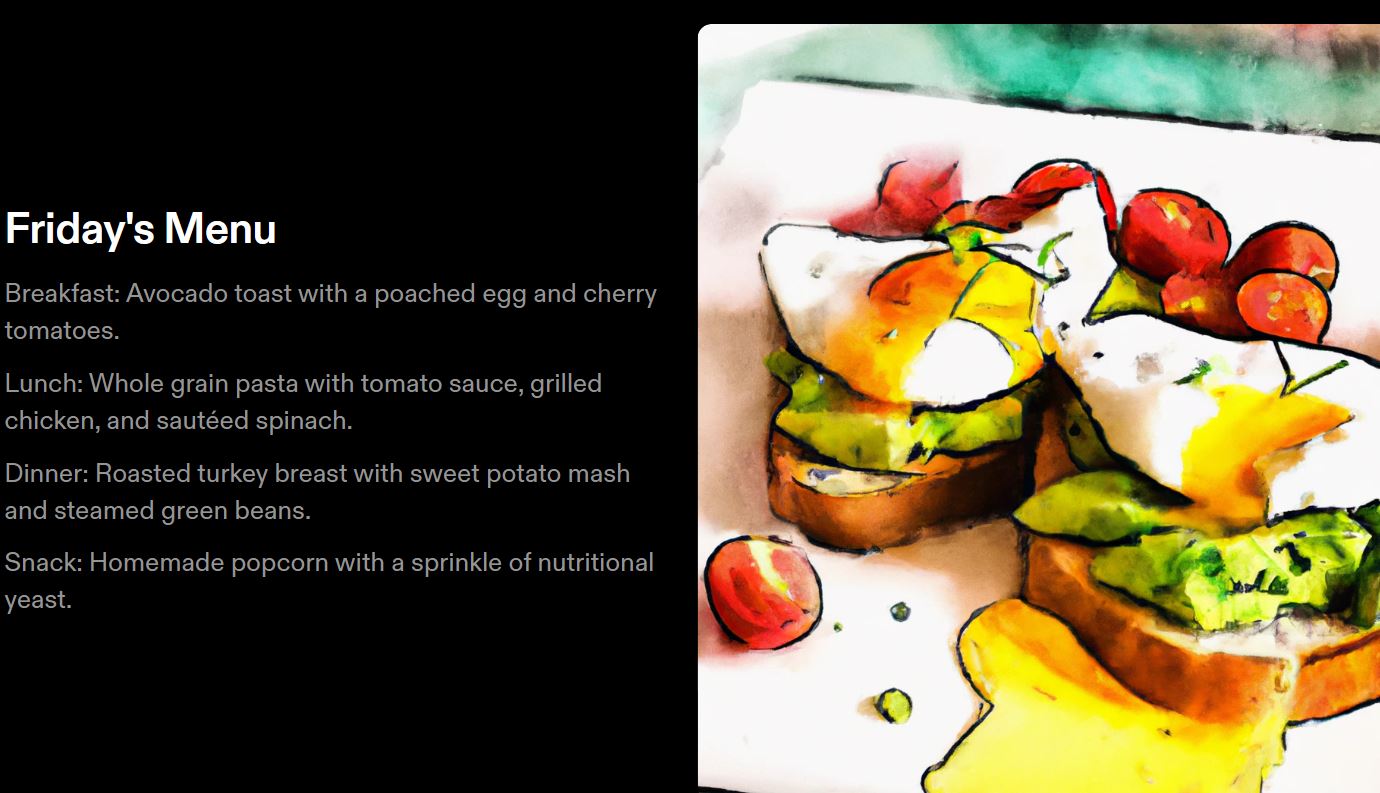 - 점심 : 그린 샐러드, 구운 닭과 아보카드, 방울 토마토