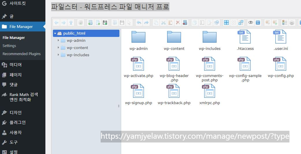 워드프레스> 플러그인 > 새플러그인 추가 > '파일 매니저' 검색하여 설치 후 활성화 합니다.