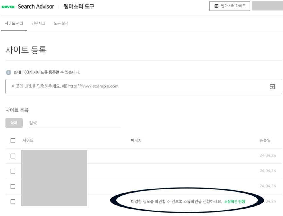 사이트 등록 후 사이트 목록 '메세지'에 소유 확인 진행을 클릭합니다.