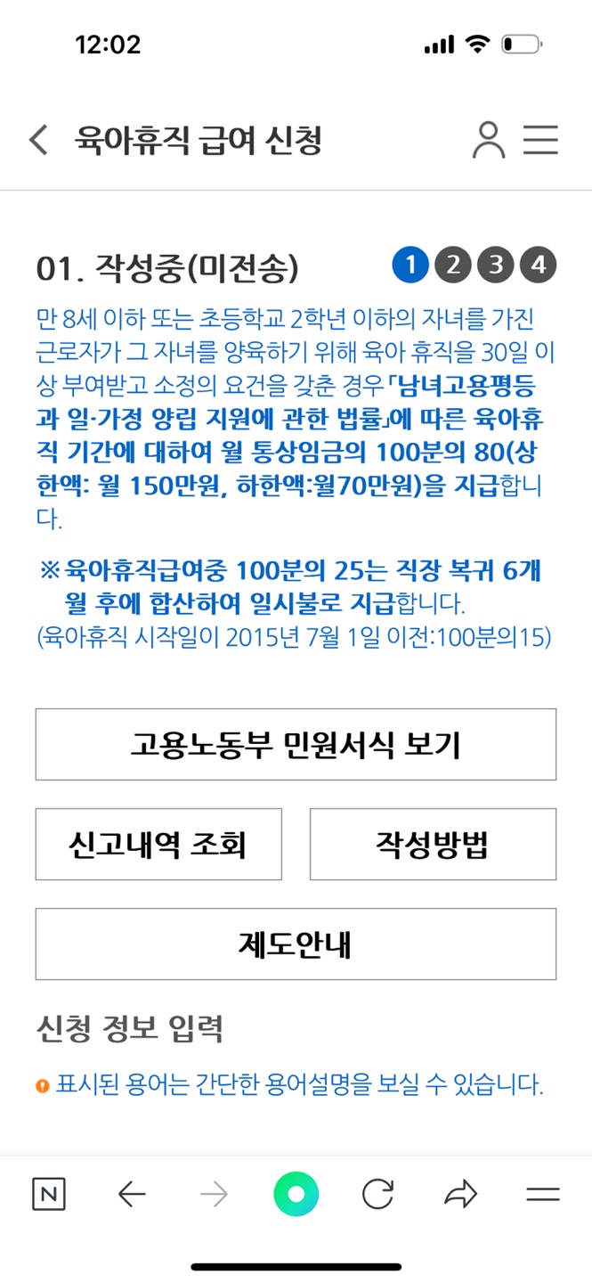 회사에서 발급받은 육아휴직 확인서 1부 (최초 1회) 및 급여 신청서, 통상임금 사본 등을 제출해야 하며 고용노동부 홈페이지나 모바일앱에서 간편하게 신청하실 수 있습니다. 보통은 회사에서 등록을 해주기도 해서 확인서를 직접 제출할 필요는 없으나, 회사에서 등록해주지 않는 경우 관할청 고용센터 모성보호담당자에게 팩스나 이메일로 전송하여도 무방합니다.