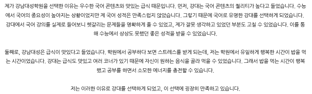 또한 재수 기숙학원을 실제 이용했던 학생들의 후기도 꼼꼼하게 살펴보아야 합니다. 아무래도 실제 합격자들이나 이용자들의 만족도가 높은 곳이 신뢰가 가기 때문입니다.