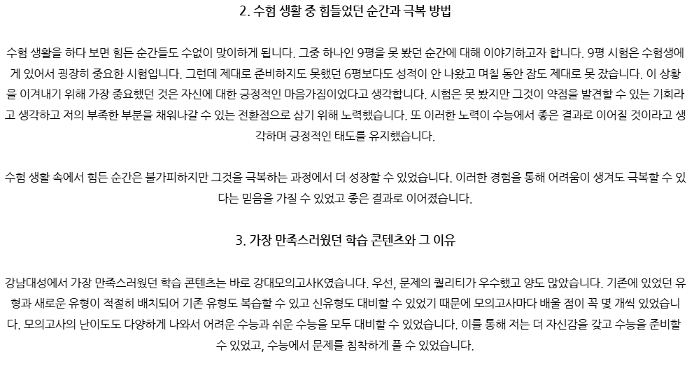 모의고사 위주로 공부했고 재수 기숙학원에서 제공하는 프리미엄 모의고사들을 통해 문제해결능력과 시간 관리 능력을 키웠습니다. 모의고사를 풀며 피드백을 통해 부족한 점을 메꾸려고 노력했고 여러 다양한 문제들을 접할 수 있다는 장점이 있었습니다. 재수 기숙학원의 장점은 불규칙한 생활 패턴을 고쳐주었고 정해진 시간에 수업과 식사, 운동을 하며 규칙적인 삶을 살 수 있게 되었습니다.