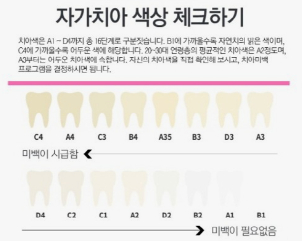 한 일주일 정도 해보니 치아가 정말 밝아졌더라고요. 치아색상표가 있는데 여기서 제가 처음에 B3정도의 단계였다면 일주일 정도 지난 지금 A3정도의 치아색을 가지게 된 것 같습니다.