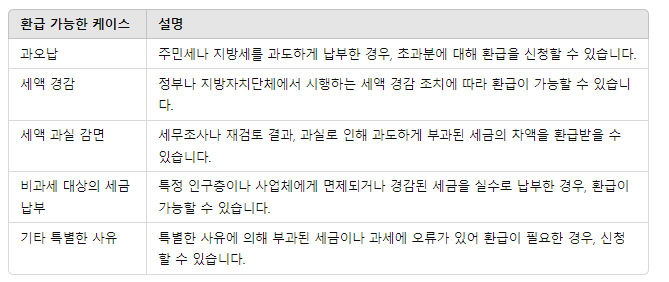 주민세 및 지방세 환급신청은 과오납이나 세액 경감 등의 사유로 인해 환급이 필요한 경우 신청할 수 있습니다. 환급 신청 절차는 각 지방자치단체의 세무과에서 담당하며, 필요한 서류를 제출해야 합니다.