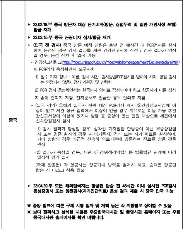 2. 중국 입국시 코로나 검사 조건 (4/29일부터 변경)