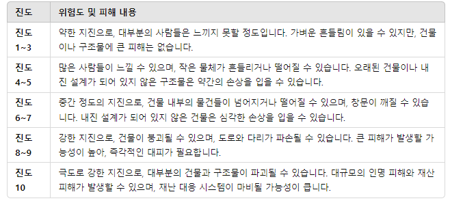 지진의 강도를 나타내는 진도는 지진 발생 시 느껴지는 흔들림의 정도를 말합니다. 진도는 각 지역의 지질학적 특성과 건물의 구조에 따라 다르게 나타날 수 있습니다. 진도는 1부터 10까지의 단계로 나누어지며, 각 단계별 위험 요소와 피해 정도는 다음과 같습니다.