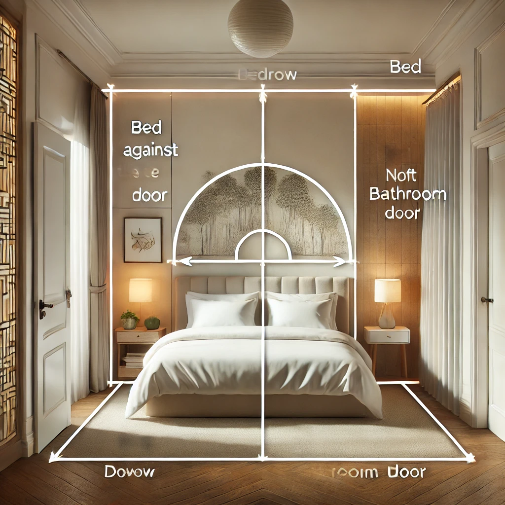 - 침대가 방문과 정면으로 마주하면 에너지의 흐름이 방해받아 숙면에 어려움을 겪을 수 있습니다. 이를 피하기 위해 침대를 방문에서 약간 비껴 놓는 것이 좋습니다.