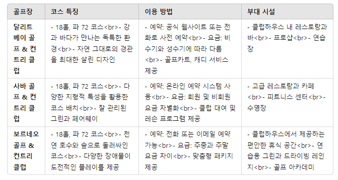 코타키나발루의 골프장들은 각각의 매력과 특색을 가지고 있어, 골프 애호가라면 꼭 방문해볼 만한 곳들입니다. 달리트 베이 골프 & 컨트리 클럽은 아름다운 자연 경관과 고급스러운 시설로, 사바 골프 & 컨트리 클럽은 다양한 난이도의 코스와 도심 접근성으로, 보르네오 골프 & 컨트리 클럽은 한적한 자연 속에서의 특별한 경험으로 각광받고 있습니다.