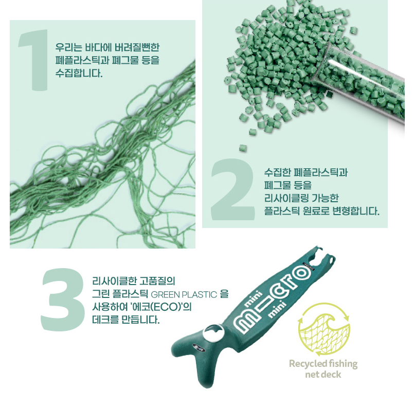 사실 킥보드는 브랜드가 많긴 하지만 개인적으로 마이크로 킥보드를 좋아하는 이유는 안정성과 핸들링에 있습니다. 핸들이 그립감이 좋을 뿐만 아니라 아이들도 쉽게 탈 수 있도록 설계가 되어있더라고요. 또한 '에코'라인은 폐플라스틱과 폐그물 등을 활용해서 리스이클한 원재료로 만들어서 환경을 생각한다는 점도 의미가 있습니다.