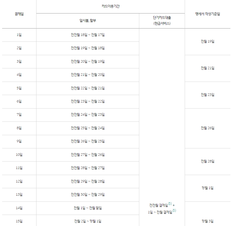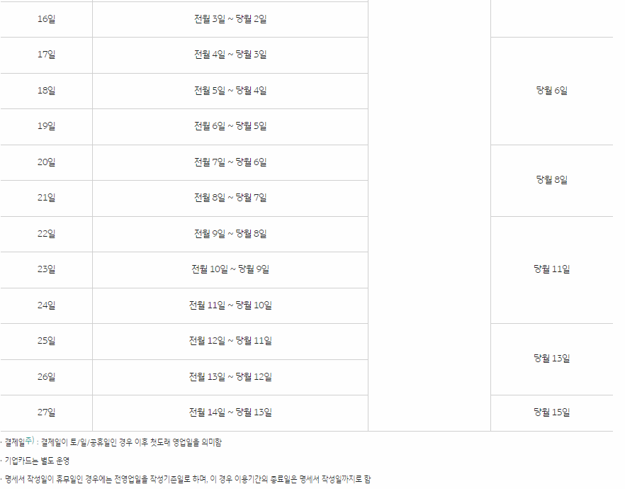 KB국민카드 결제일 및 결제일별 이용기간